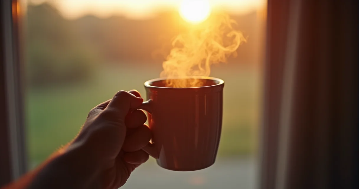 Close-up de uma xícara de café fumegante sobre uma mesa de madeira rústica, com luz dourada do amanhecer incidindo suavemente.