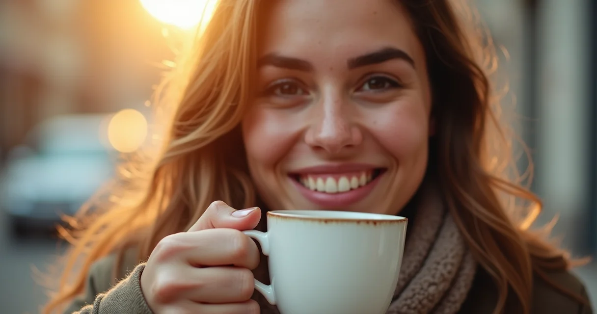 Uma pessoa sorrindo levemente, com os olhos fechados, enquanto segura uma xícara de chá quente nas mãos. A iluminação suave realça a expressão de contentamento e relaxamento.