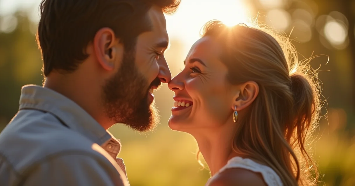 Um casal sorrindo um para o outro com o sol da manhã incidindo suavemente em seus rostos, em um ambiente externo com vegetação desfocada ao fundo.